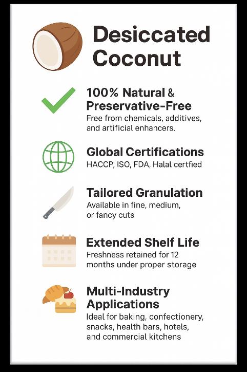 | Desiccated Coconut | Low-fat & high-fat (fine/medium/fancy cut) | Versatile food-grade ingredient; stable quality; 12-month shelf life |